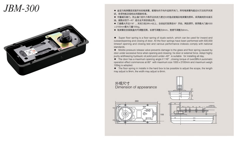 *金宝马地弹簧是双面开关的地弹簧,能够向内于向外运转开关门,所有地弹簧均超过10万次的开关测试,各项性能及指标达到国家标准。