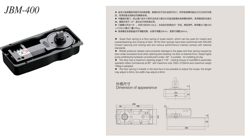 *金宝马地弹簧是双面开关的地弹簧,能够向内于向外运转开关门,所有地弹簧均超过10万次的开关测试,各项性能及指标达到国家标准。