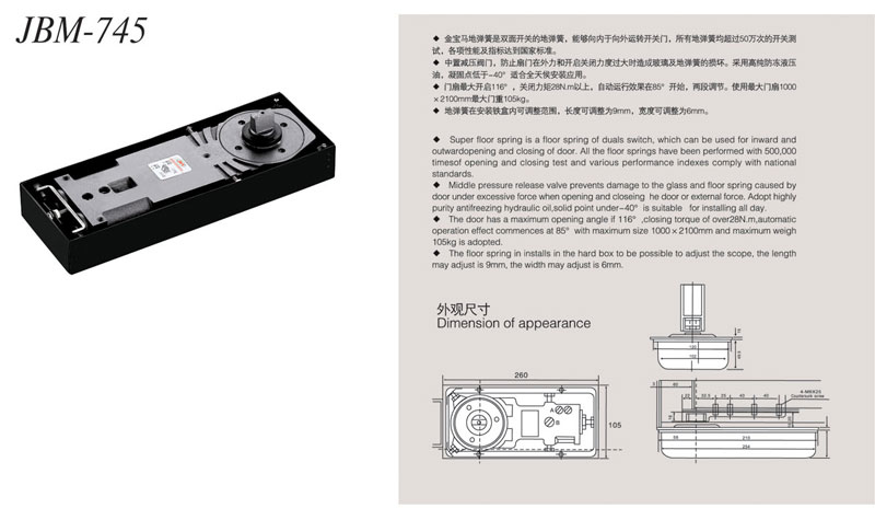 *金宝马地弹簧是双面开关的地弹簧,能够向内于向外运转开关门,所有地弹簧均超过10万次的开关测试,各项性能及指标达到国家标准。